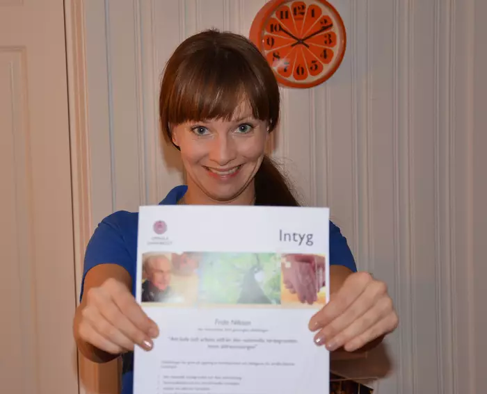 Alevas verksamhetschef Frida Nilsson visar upp sitt utbildningsbevis för Socialstyrelsens värdegrundsutbildning för chefer inom äldreomsorgen. Ledarskapsutbildningen är en statlig satsning som görs för att stärka och utveckla kompetensen hos enhetschefer och ledare i äldreomsorgen. Barn- och äldreminister Maria Larsson: